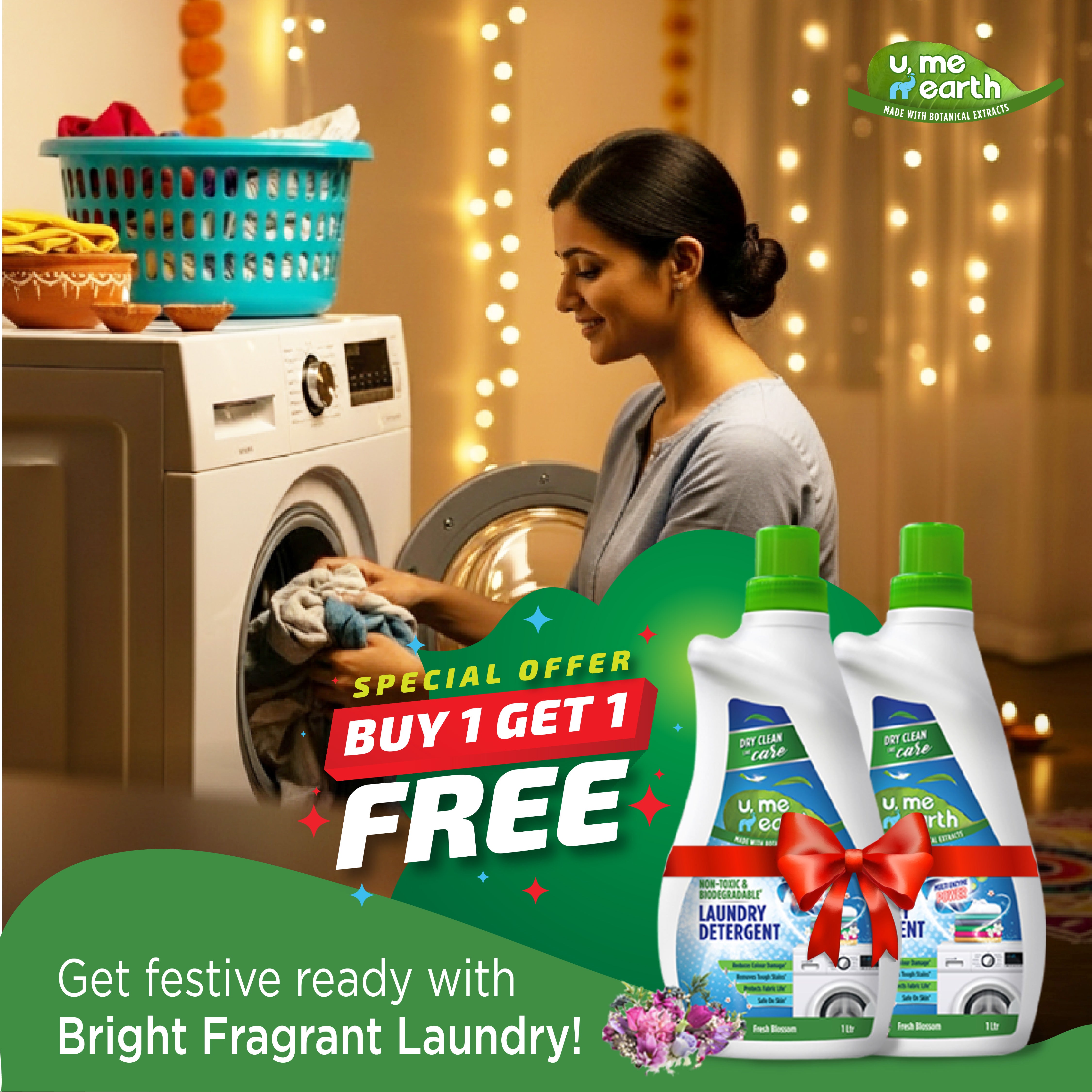 U Me and Earth Laundry Detergent is crafted with a powerful, safe and sustainable technology that ensures your clothes will always have a fresh and new appearance. Enriched with Bio Enzymes & plant based surfactants it uses non-pathogenic good bacteria to break down the stains into smaller particles and washes them away easily. Its Multi Enzyme power removes stains without damaging the fabric threads thus protecting fabric life and retains the fabric color upto 98%* levels. Made with non-toxic and bio degradable ingredients our product is pH balanced, hence safe for skin and non-polluting to mother earth. It’s time to upgrade to Dry Clean like care of your clothes at home.